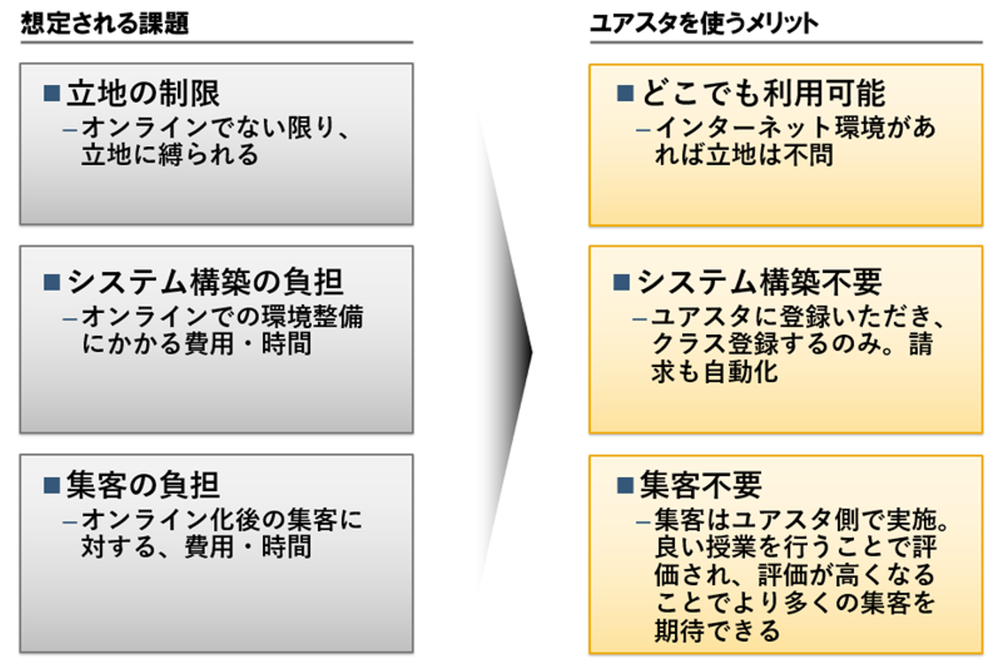 前の記事にも書きましたが、ユアスタでクラスを実施いただくことで以下のようなメリットがあります。