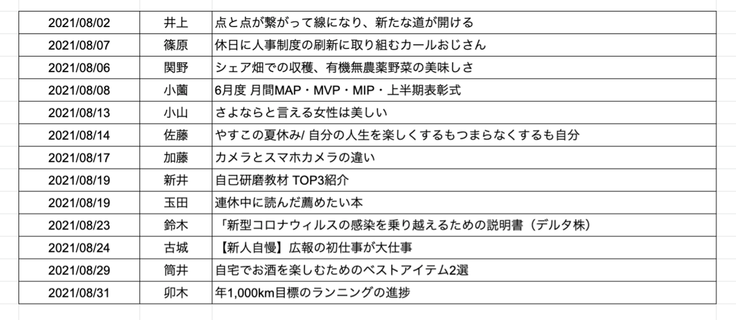 ↓こちらは、8月投稿内容です(タイトルだけお見せします)。プライベートの共有から仕事を通しての気付きまで、続々と気になる投稿が流れてきます。