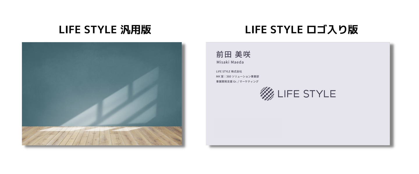 LIFE STYLEでは、複数顧客の複数案件を掛け持つメンバーも多いため「商談時に社名の入った背景を切り替えるのが大変」、けれど・・・「複数人でMTGに入る際に統一感のある背景を使いたい」といった声が上がっていました。そこで、どの会議でも対応できる汎用版の背景と、氏名や所属部署などの入ったロゴ入り版の2パターンの背景を制作しました。