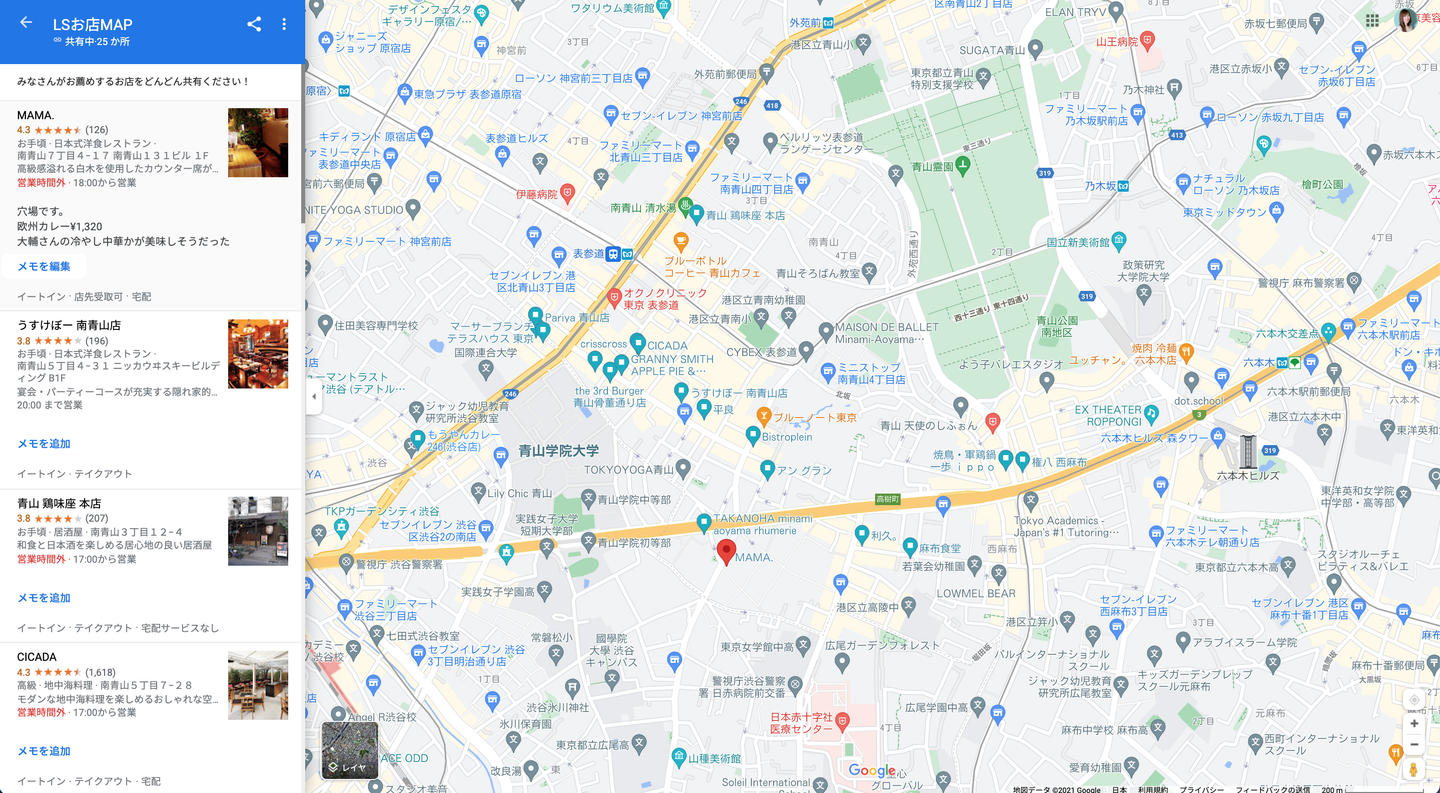 入社して間もない新卒メンバーやこれから入社するメンバーに「近場の美味しいランチスポットを紹介できたら良いよね!」ということで、先輩社員御用達のお店を「LIFE STYLEお店MAP」に登録しましょうね!という取組みです。続々とお店が追加され、あっという間に掲載件数30件を超えるリッチなMAPに。いつでも誰でもGoogle Mapからランチの行き先を見つけられるようになりました。