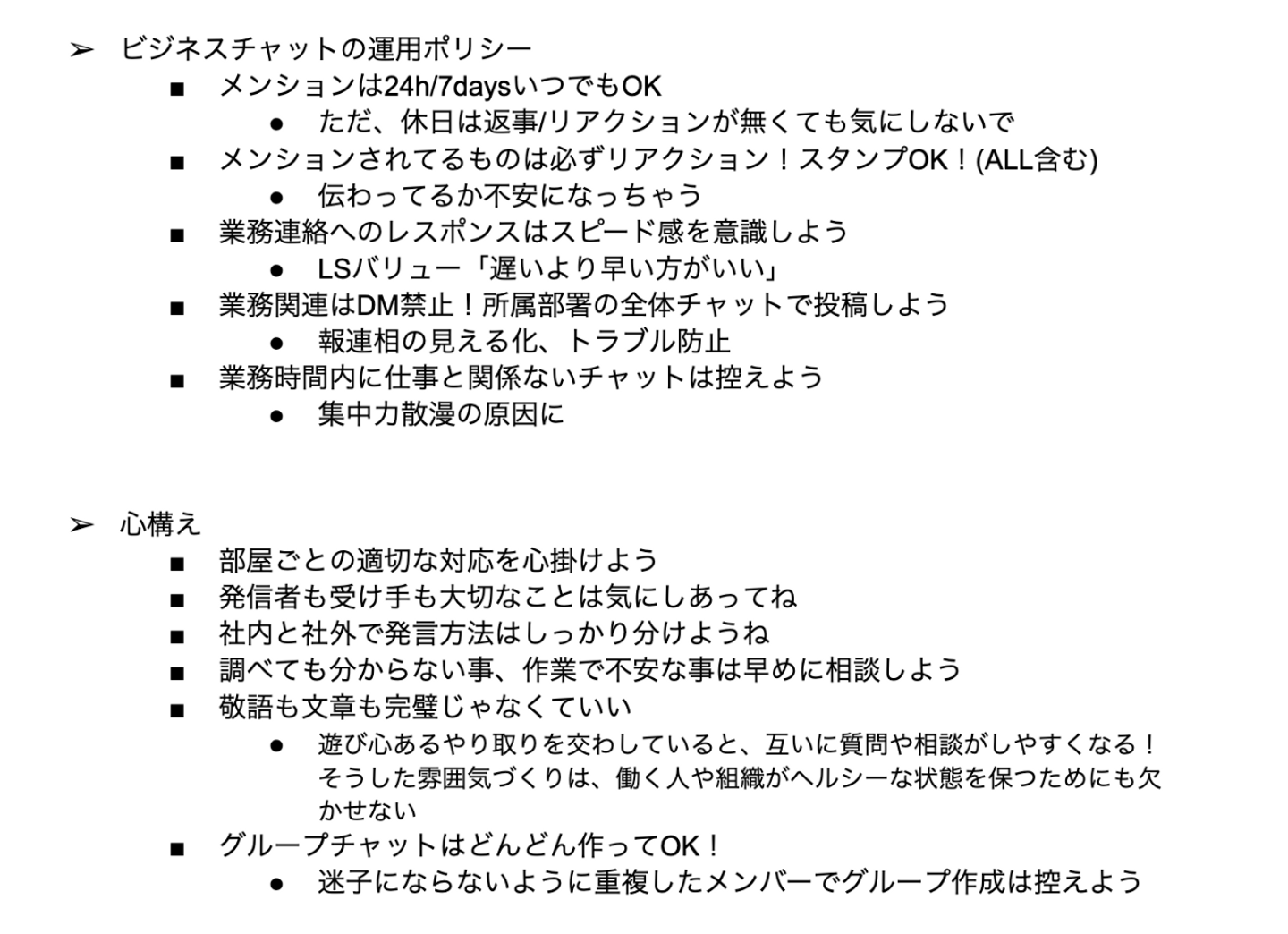 また、業務上のやり取りを行う社内ビジネスチャットについても、「新卒の子たちが入るのに、きちんとした運用ルールってないよね?」「チャットでのやり取り、何に気をつけたらいいのかわかりやすい方がいいよね?」「私たちも改めて共通認識を持とう」ということで、現場メンバーと役職者による議論の上、それぞれの意見を反映した運用ポリシーを策定しました。