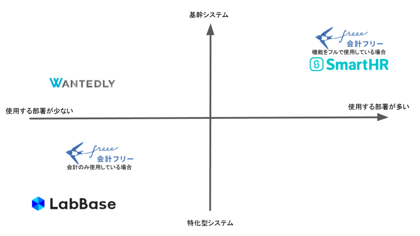 会計の機能のみ使用する場合は、使用する部署は経理のみ。しかも会計だけのシステムとなるため左下に分類されます。しかし、請求書や経費精算。ワークフローまで使用しはじめると、社内のほぼ全員が使用するシステムとなりますので、右上にポジションが変化します。