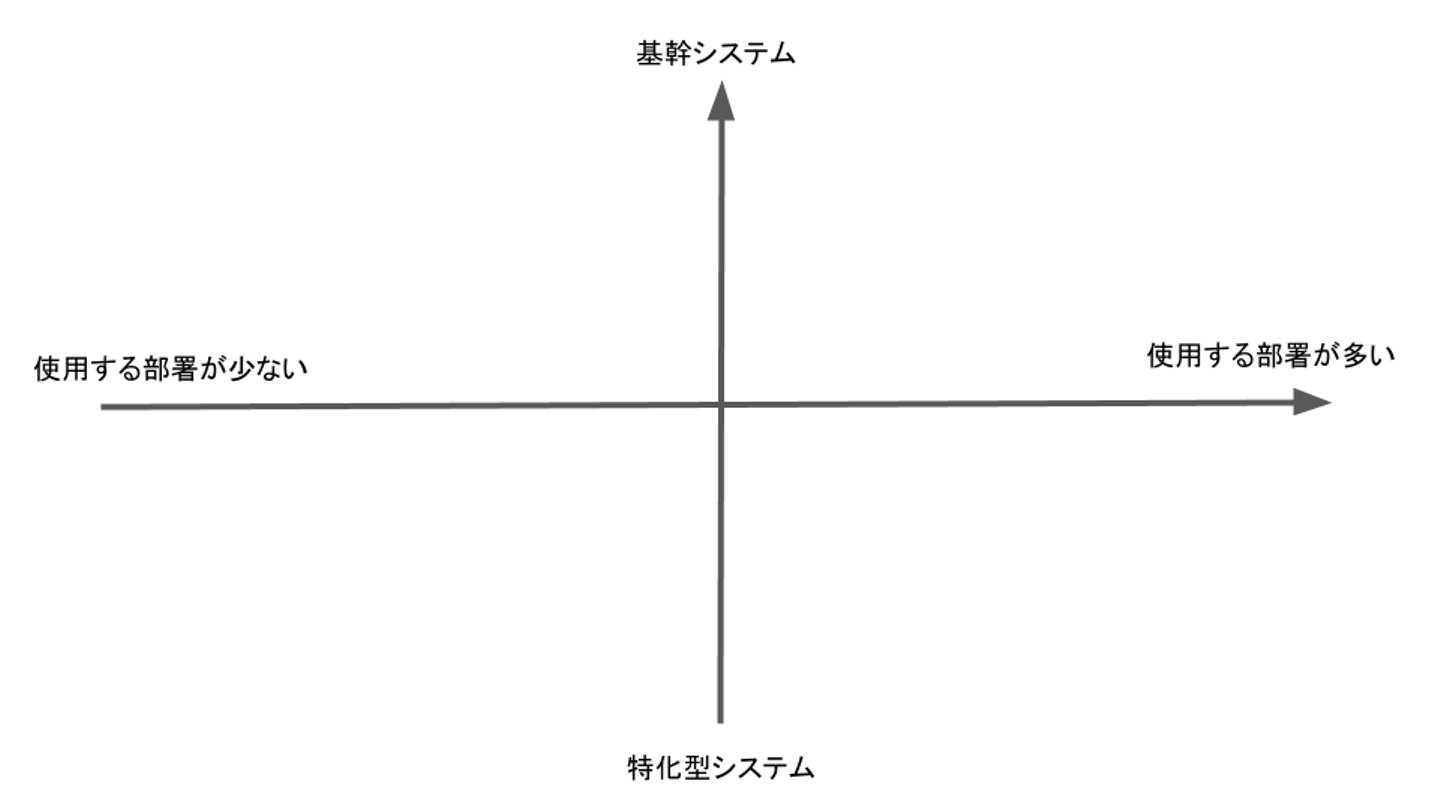 今回は、もう一つのマトリックスということで、そのサービスが顧客の中で「基幹システム」なのかという縦軸と、「そのシステムを使用する部署が多いか」という横軸をもったマトリックスで考えてみます。