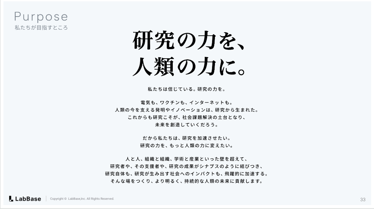 LabBaseのパーパス「研究の力を、人類の力に。」は、今までもこれからも変わらず追い続けたいと思っています。
