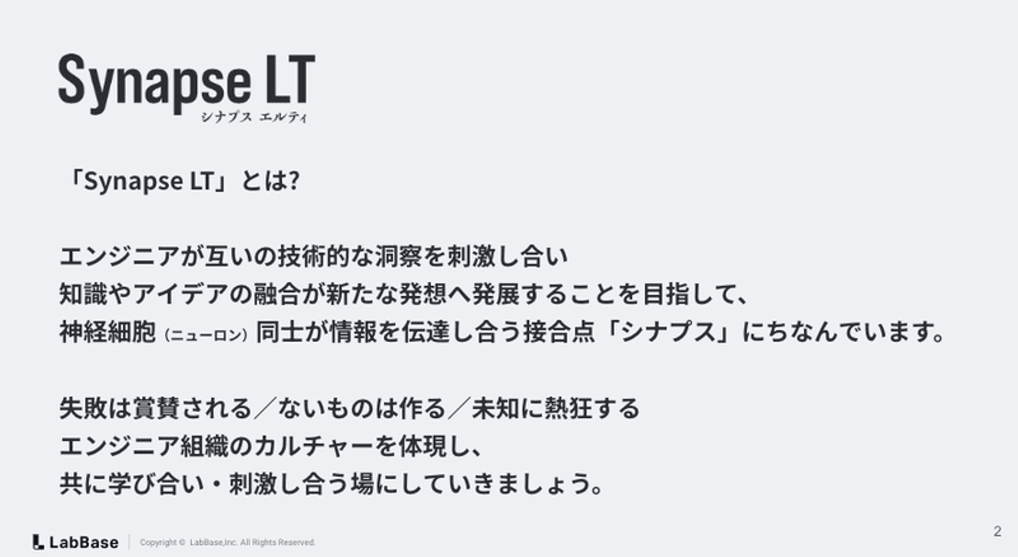 株式会社LabBaseでは、週に一度「Synapse LT(シナプスLT)」というオンラインのLT会が開催されています。今回はLT会には欠かさず参加するというドイツ出身でプラットフォーム開発本部のヤーノシュさんと、このLT会を主催するリサーチエンジニアの松井さんにお話を伺います。