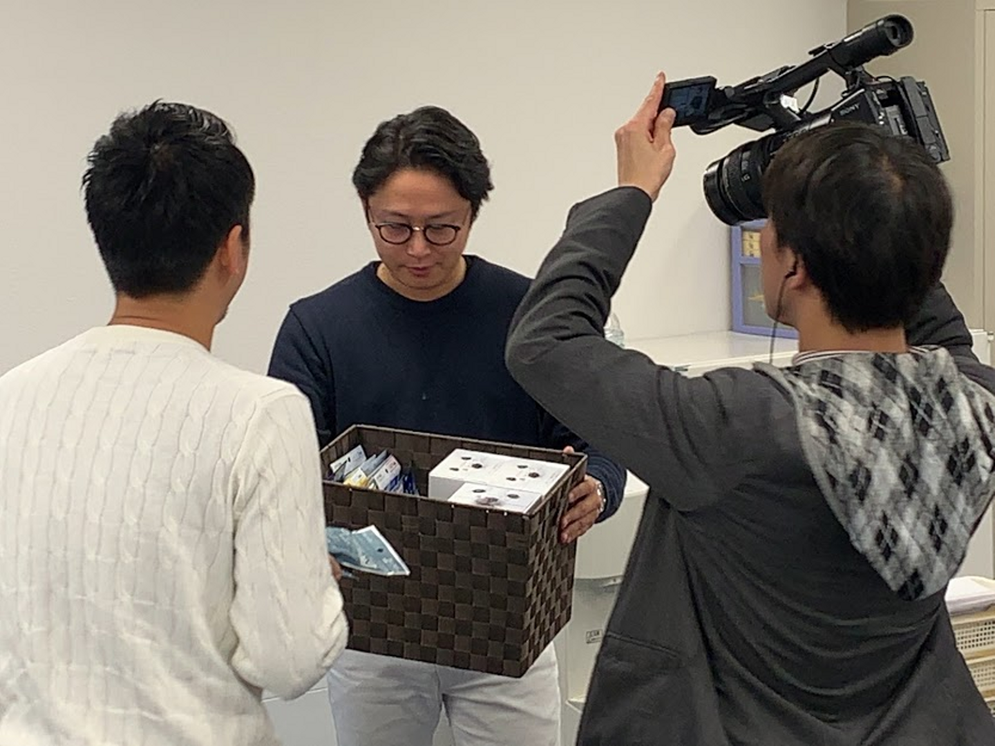 ▼撮影の様子①(高級ティッシュ、高級マスク支給の様子/代表取締役社長結城が手渡しで支給!)
