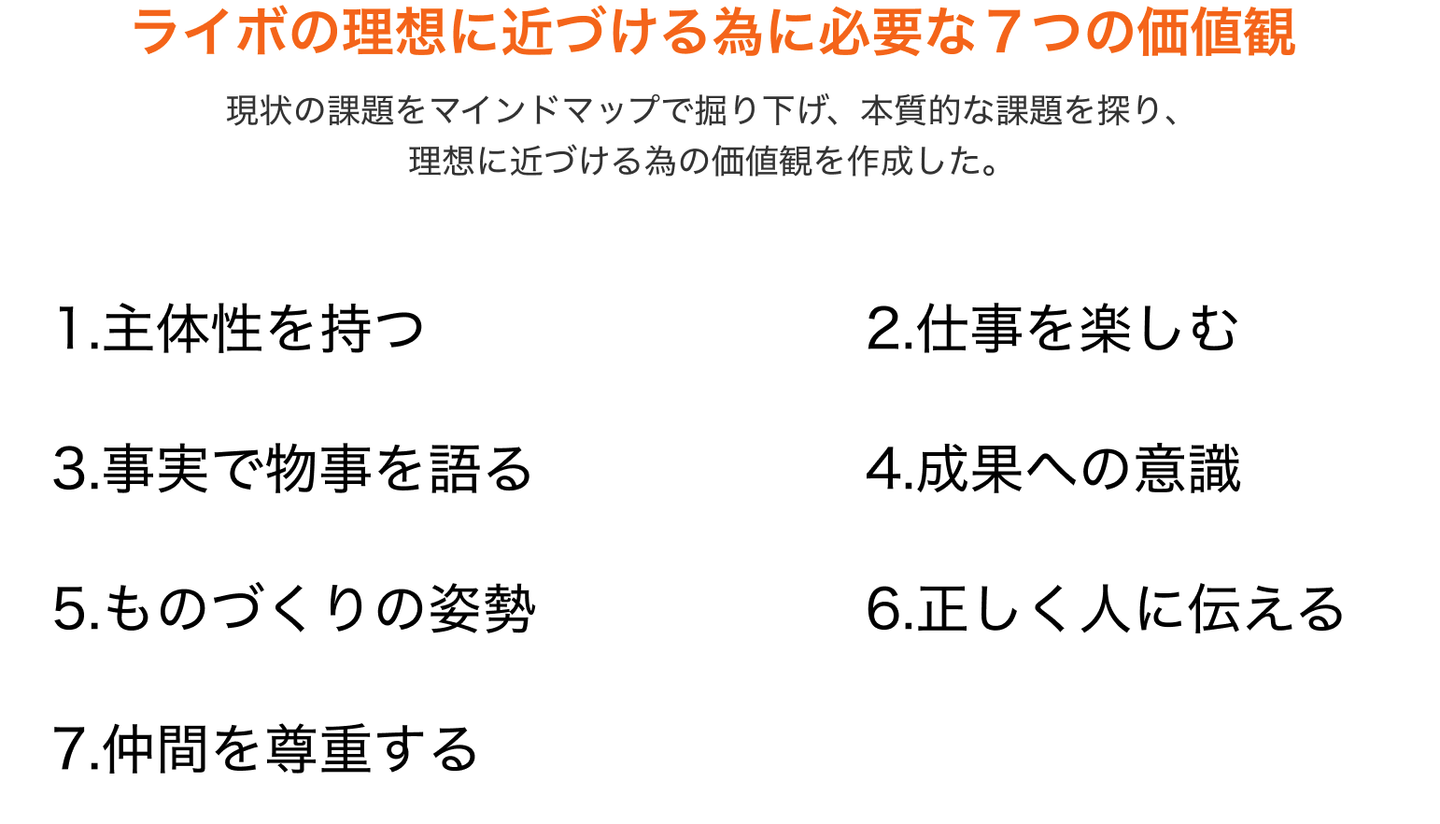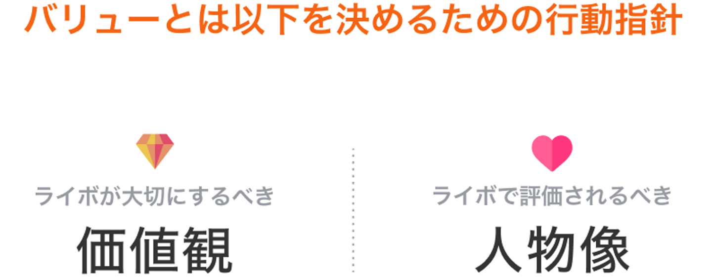 ただ、ライボは現在急成長を遂げているフェーズにあり、今後メンバーが増えてもまとまりを持ちながら、ビジョン実現に向かって進んでいけるようなチームを作るための行動指針=バリューを制定を行いました!バリューにおいては、ライボで大切にするべき価値観と、評価されるべき人物像の大きく2つのポイントに沿った行動指針となっています。