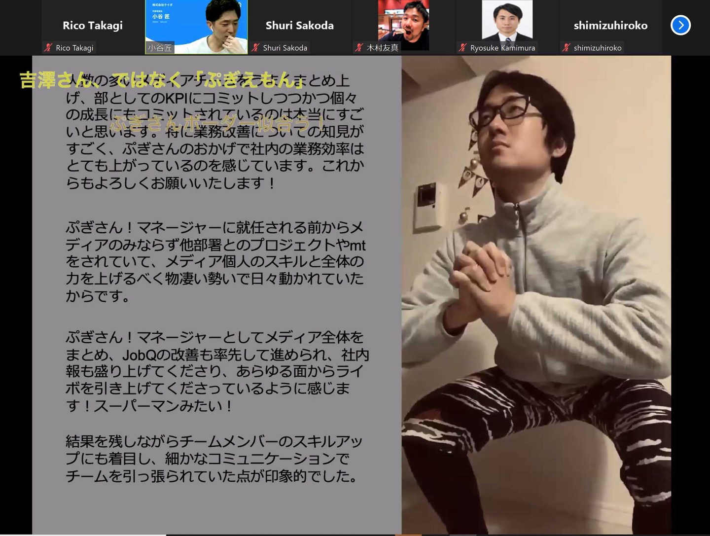 そして、全体の中から1人、総合MVPが選ばれました。第8期2Qでは、メディアグループのマネージャーであるぷぎえもんこと吉澤修が選出されました。総勢24人のメンバーがいるグループをまとめており、JobQのKPI改善等を積極的に進めています!