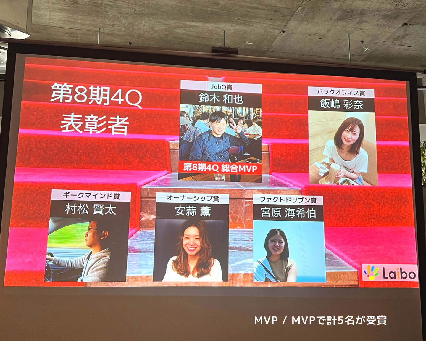 MVVの『ファクトドリブン』『オーナーシップ』『ギークマインド』賞の他、『JobQ賞』『バックオフィス賞』『新人賞』『CEO賞』も発表されました。