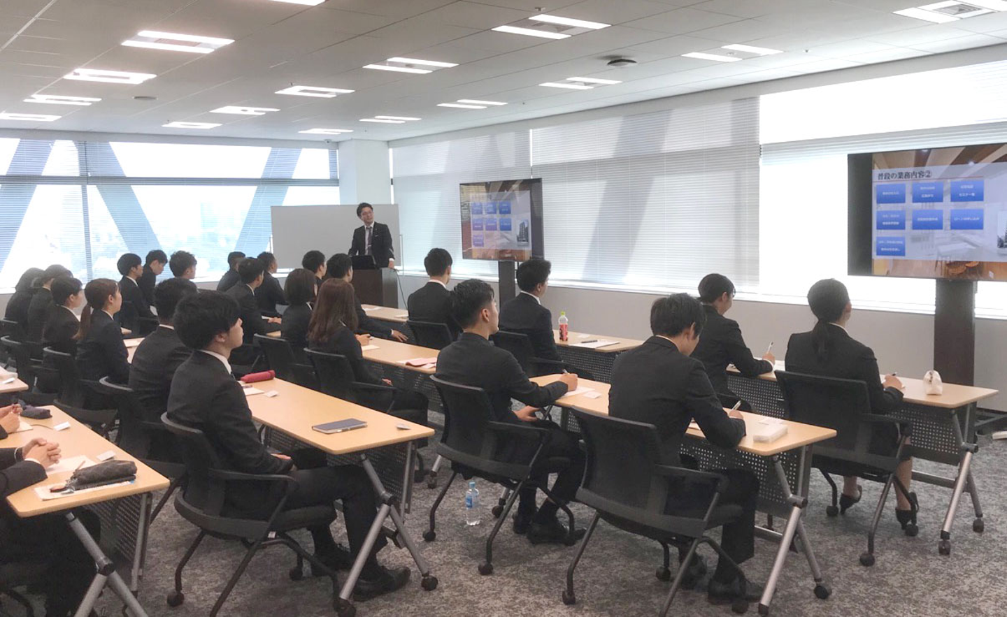内定式の前には研修が行われ、売買事業部・賃貸事業部・建築事業部・管理部・そして経営企画のそれぞれの業務内容等についての説明をしました。今年の新入社員は営業と事務のみの入社となりましたが、今年はシステムや賃貸など幅広い分野での入社が決まっています。