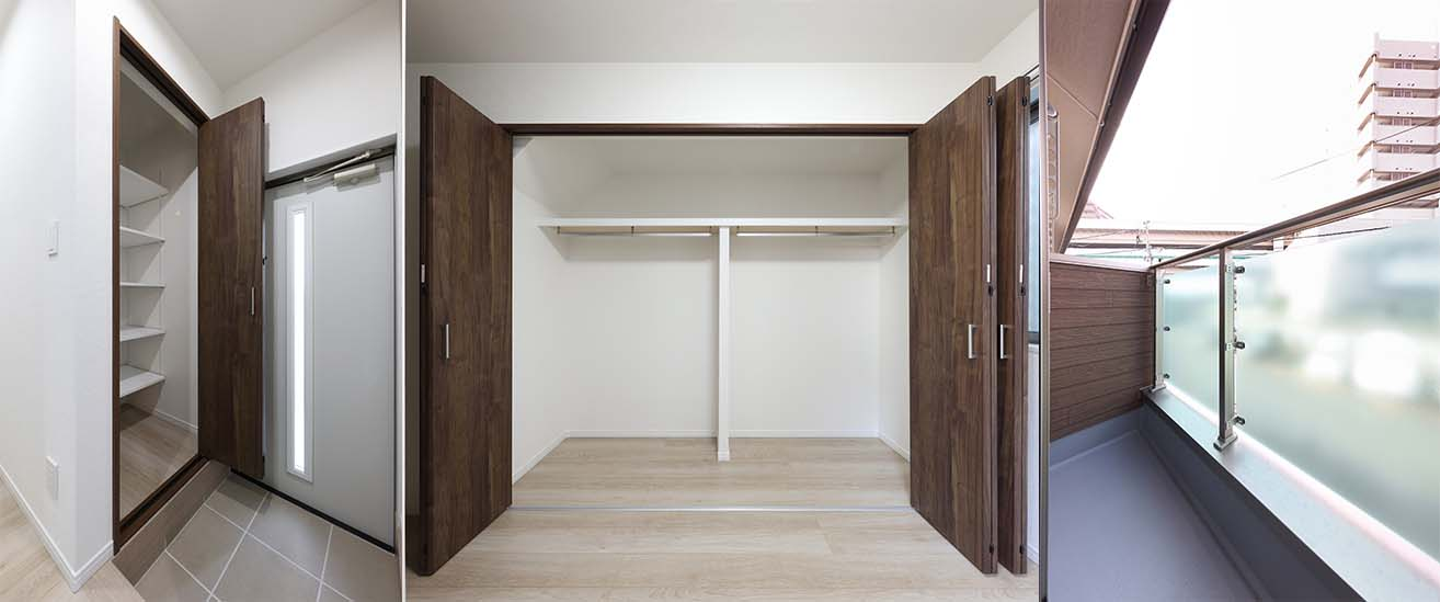 またメゾネット住宅のため、階段下などを利用して、豊富な収納スペースが確保できました。収納棚や扉はトレンドのウォールナット柄を採用。こげ茶色×深い木目の色をアクセントとして組み合わせることで、白を基調とした明るい空間の中にメリハリをつけました。