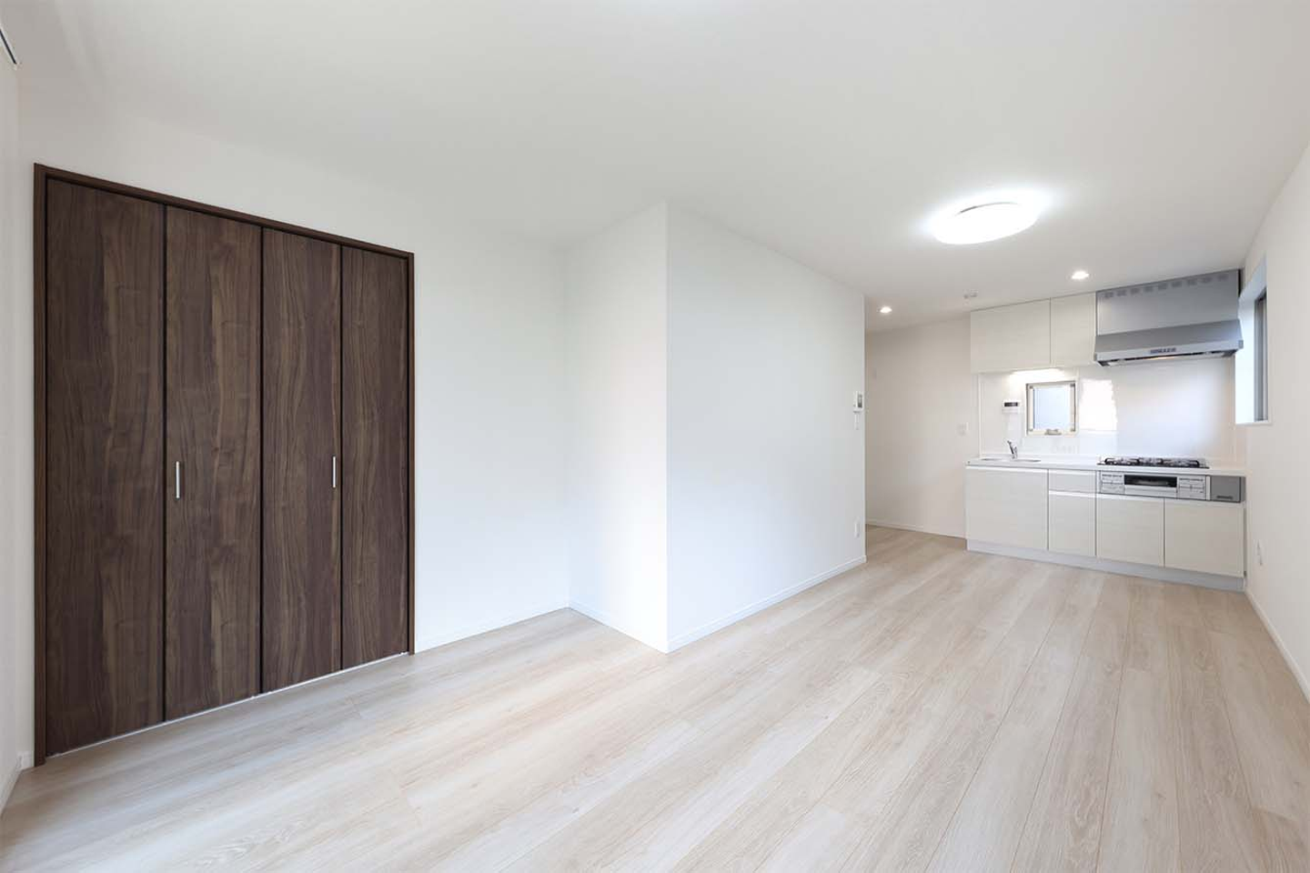 今回のリノベーションでは、白をメインカラーとした壁やホワイトウッド調のフローリング材を使用することで、奥行きのある広々とした印象に。特に床材は、お子様がいらっしゃるご家庭でも安心な傷や汚れの目立ちにくいウォッシュドオークを採用しました。