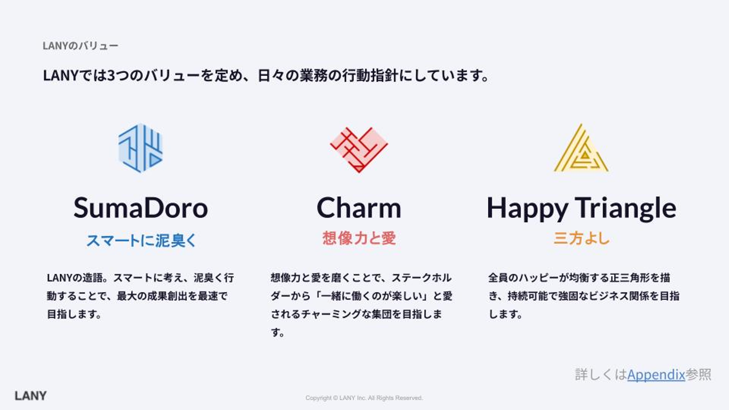 すごくうれしかったです。竹内さんから伝えていただいた受賞理由は「LANYのバリューであるSumaDoro(スマートに泥臭く)、Charm(想像力と愛)、Happy Triangle(三方よし)を体現してくれた」でした。
