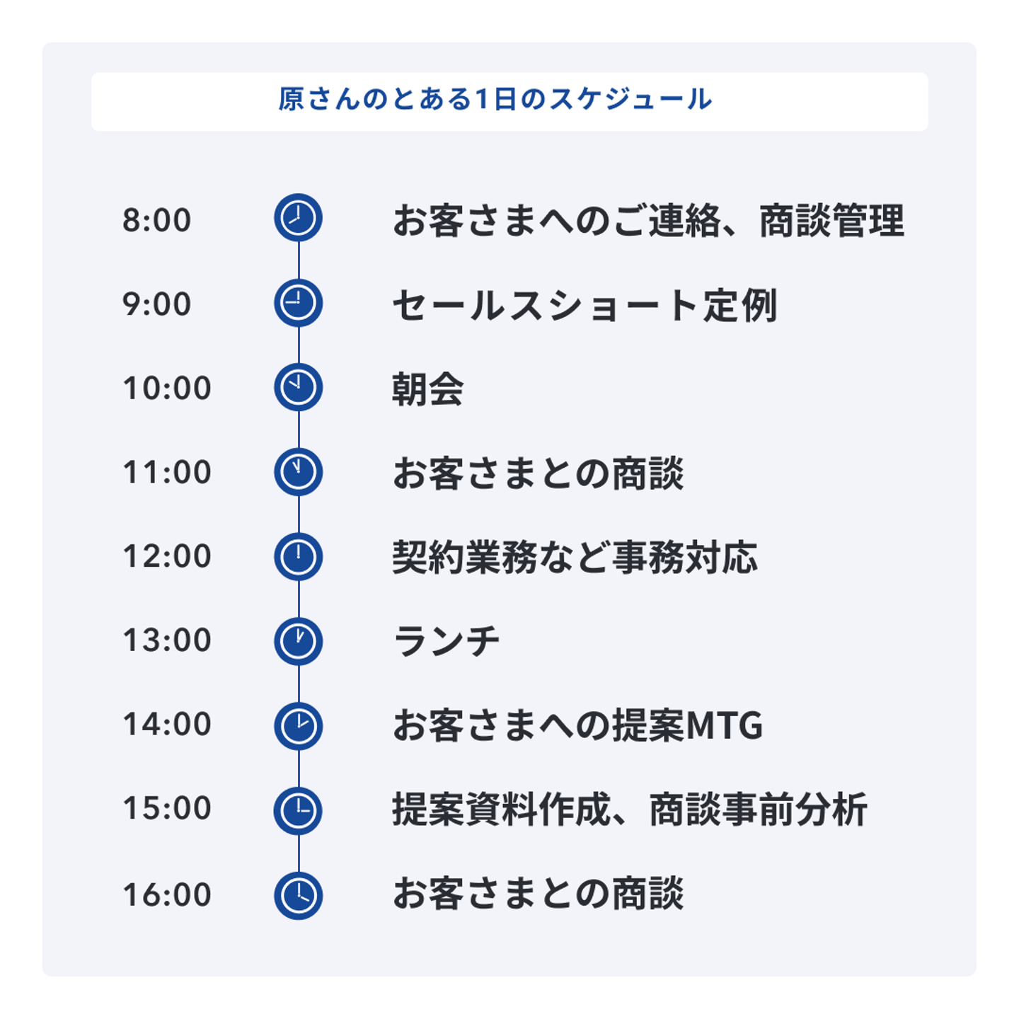 以下のタイムスケジュールはあくまで一例ですが、8時に始業してお客さまへのご連絡や商談管理をして、9時からセールスチームの定例会、10時から全体の朝会に参加。その後は商談や契約業務などの対応が多いかなと。
