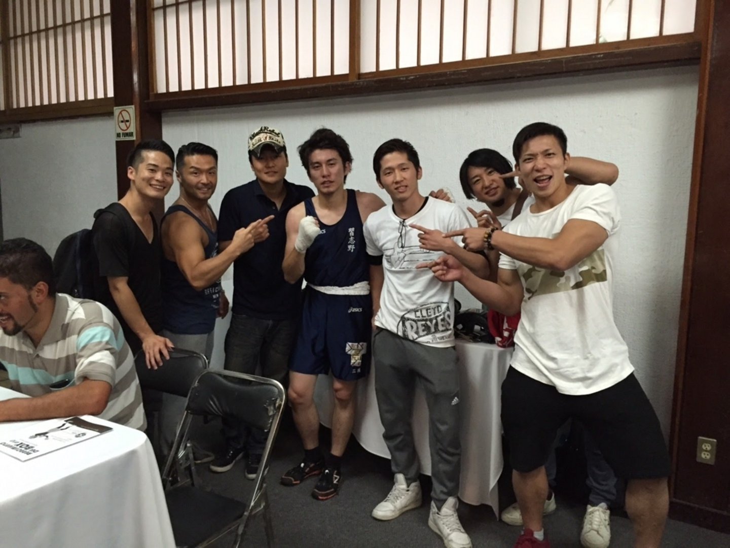 試合後、同じ宿に住んでいたレスラーの方々(知る人ぞ知る、凱旋ホヤホヤのSYO・YOHの二人です)やジムメイトたちに囲まれる私。「チバ、ハポン!」とリングでコールされたときは笑いましたw