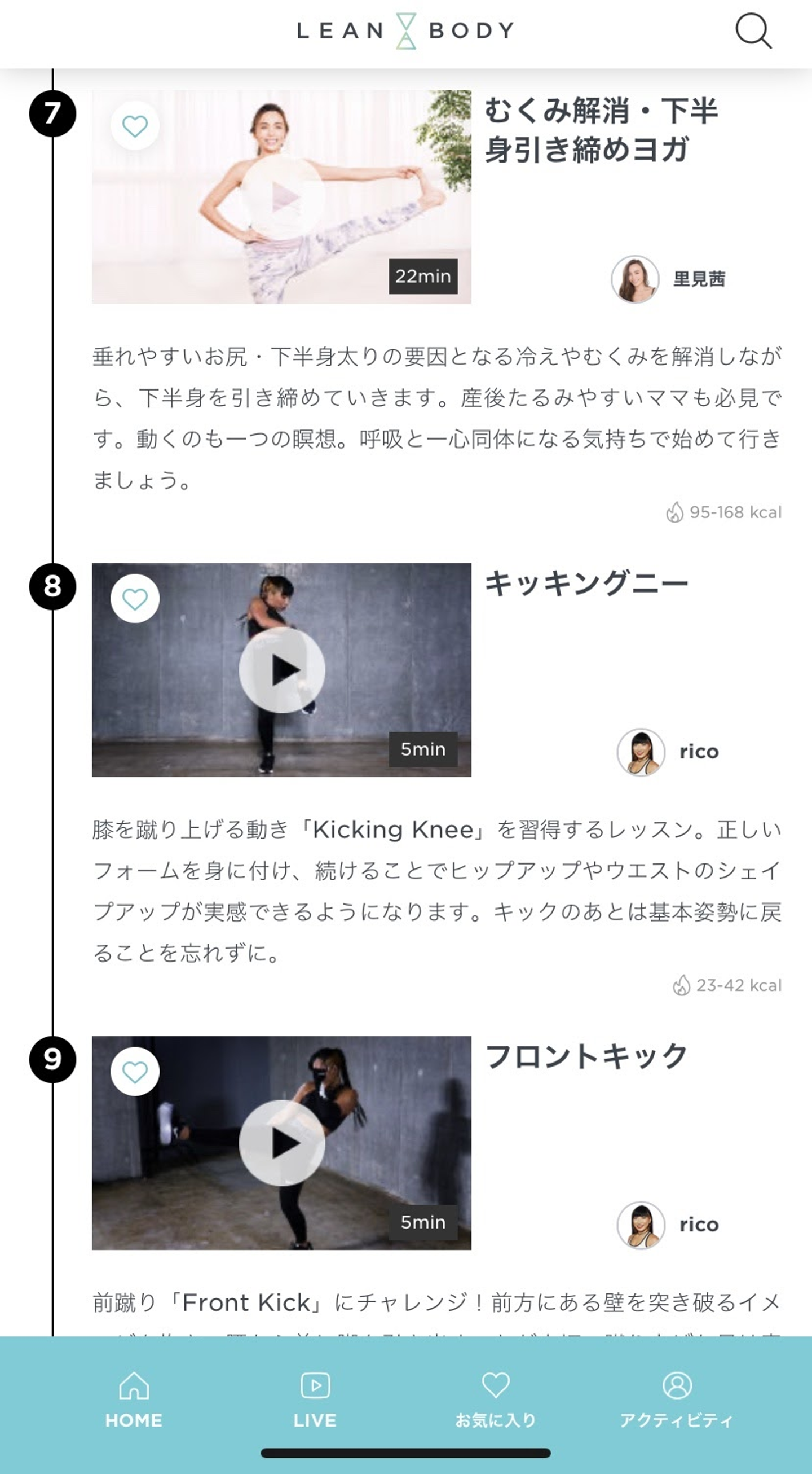 二点目はコンテンツ一本あたりの時間です。大学生である私は毎日課題に追われ、バイトに追われ…ジムに通う時間なんて無い!とフィットネスを諦めていましたが、LEAN BODYのコンテンツは短いものだと3分からあってとっても柔軟性があるなと感じました。これならオンライン授業の合間でも簡単にフィットネスができ、家でもできるオンラインフィットネスの強みが活かされていると思いました。
