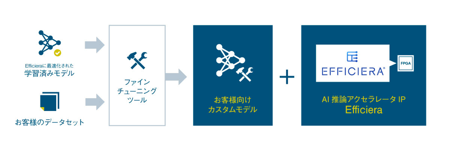 Efficiera(IP)とEfficieraに最適化された学習済みモデル、及びモデルの学習やコンパイルを行うツールからなる製品群です。ディープラーニングを実行するためには莫大な計算コストと大量の電力が必要とされますが、様々な技術によって小さい消費電力でディープラーニングを実行できるようにしたものです。