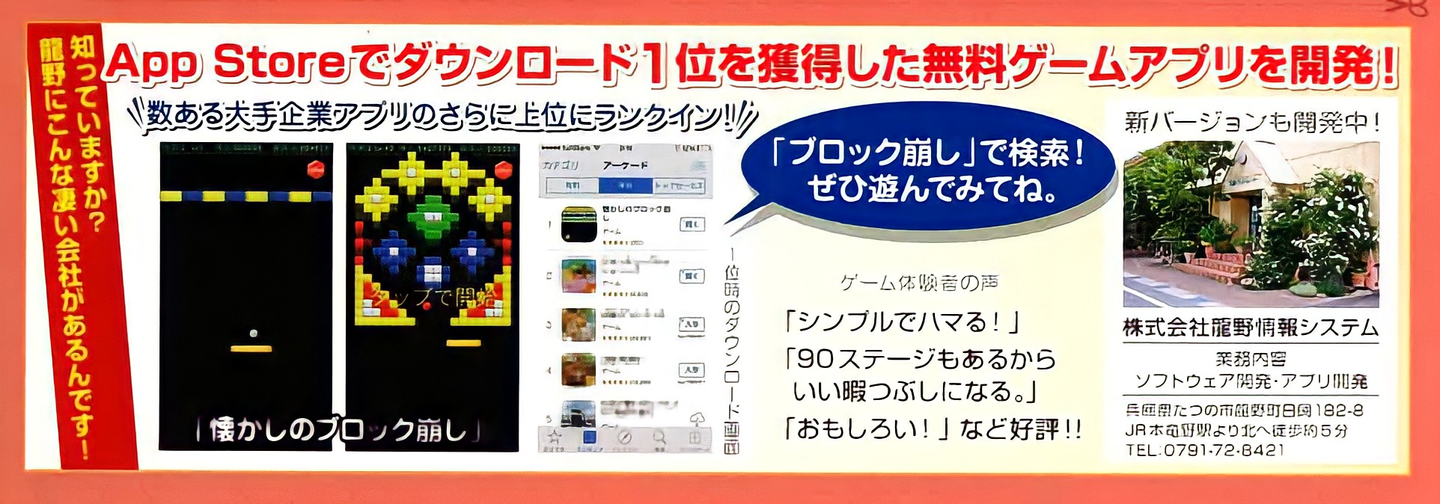 弊社が開発した「懐かしのブロック崩し」 というアプリが非常に人気がでたタイミングで、たつの市専用のクーポン紙のCM枠に載せました。(クーポン紙は現在はもう終了しているようです。)「懐かしのブロック崩しがApp Storeで1位になりました!」みたいなゲームアプリのプロモーションっぽい感じで出しましたね。これはダウンロード数を稼ぐ目的ではなく、「たつの市にこんな会社があるんだ!」と思ってもらえるような、知名度アップを目的とした広報活動として利用しました。
