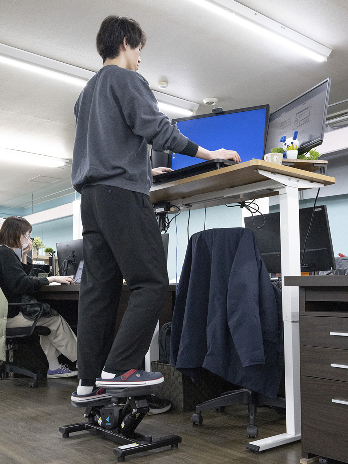 座っている時間が長いと健康に悪いので、基本的に立ってステッパーを踏みながら仕事をしています。ステッパーに乗るとキーボードの位置が低くなってしまうので、卓上デスクは高さを調整するためのものです。ポモドーロタイマーを活用して意識的に小休憩を取るようにすると効率も上がりますし、仕事終わりの疲れも少なくていい感じです。