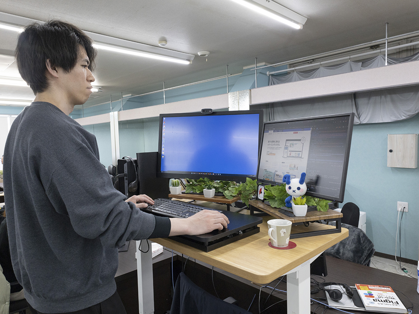 本社のインフラ構築・管理を一手に担う佐藤氏。得意のDIYで電動昇降デスクを改造しているのがインフラエンジニアっぽい(?)ですね。