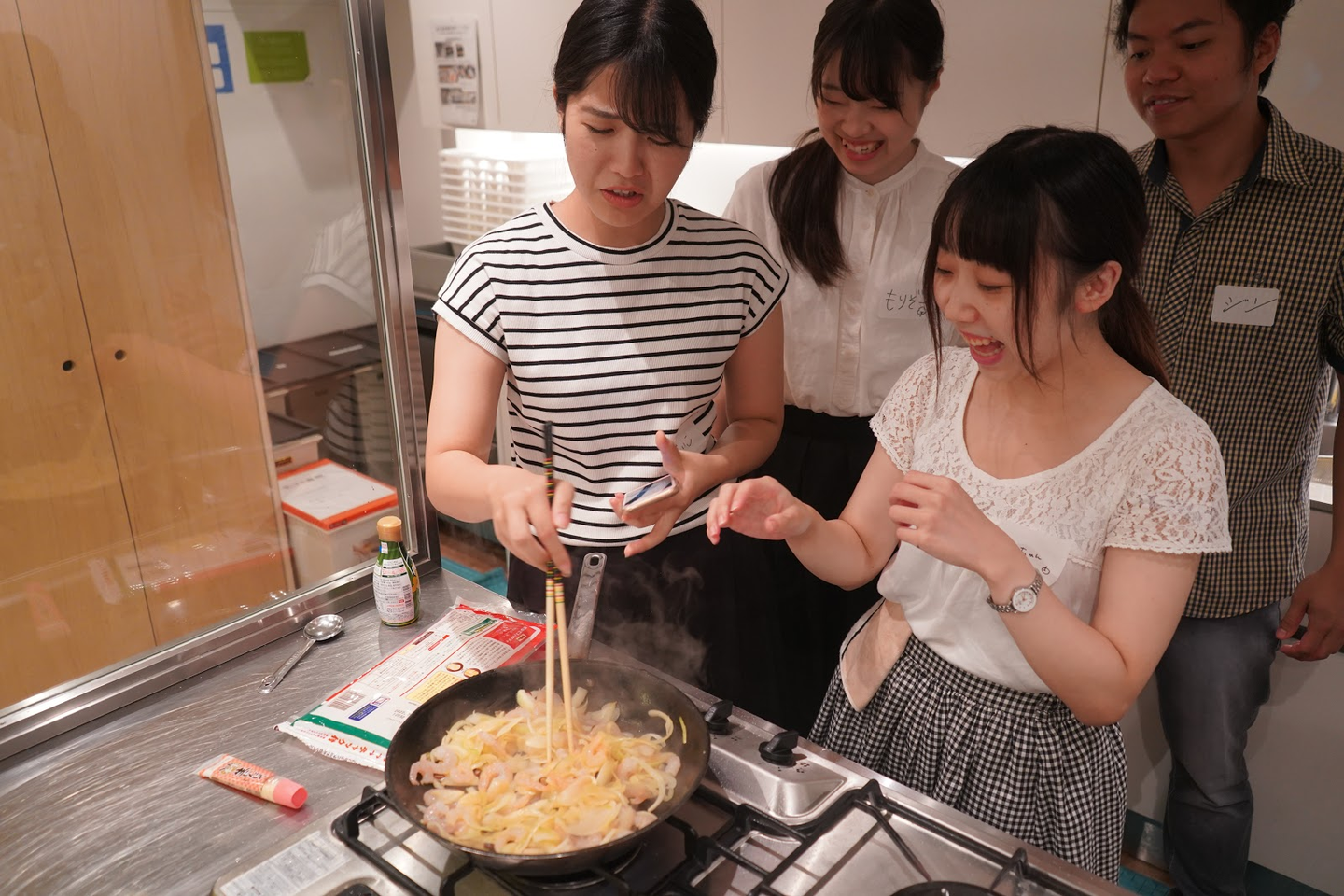スマホを片手に、器用に調理を進める内定者たち、感心しまくりです。