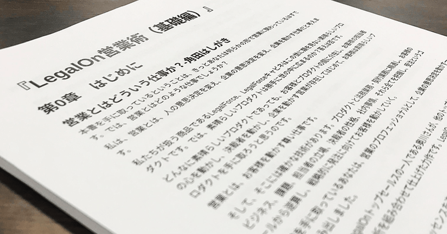製本化すると100ページにも及ぶのですが、これ1冊を読めばトップセールスになれる『LegalOn営業術(基礎編)』を制作しました。