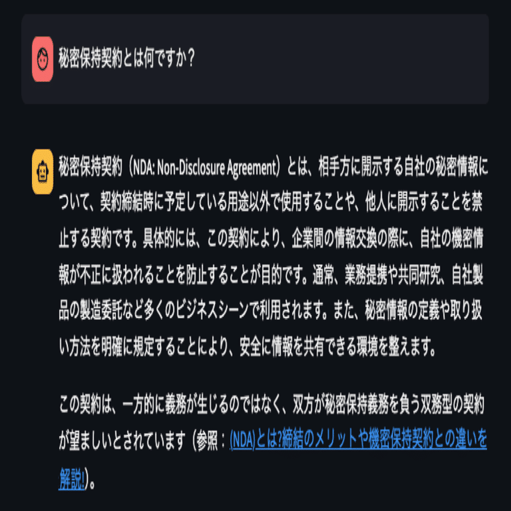 当社サービスのひとつである「契約ウォッチ」とChatGPTを連動させることで実現した、AIが質問に対して自ら判断し、関連するドキュメントを検索して回答を生成するシステムです。
