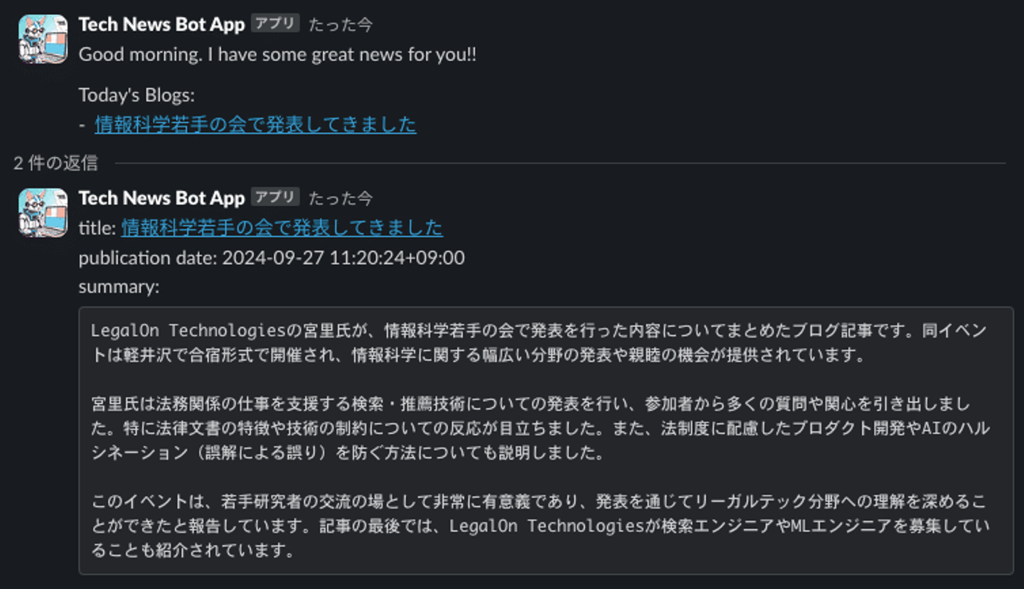 検索・推薦チームでは日々技術記事などを共有し合っていますが、「この作業を半自動化できないか」ということで、技術関連のブログやニュースを自動収集し、Slackに投稿するBotが開発されました。