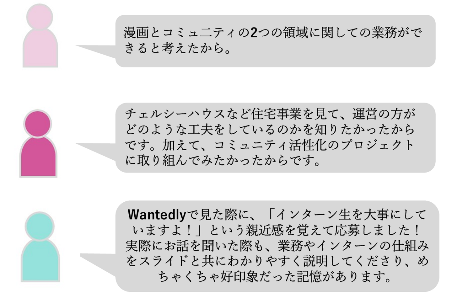 マンガやコミュニティ運営への興味が理由の方が多いようです!私もLEGIKAに入った1つの理由が、マンガが好きで業界理解を深めたかったからです。