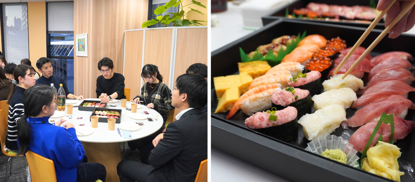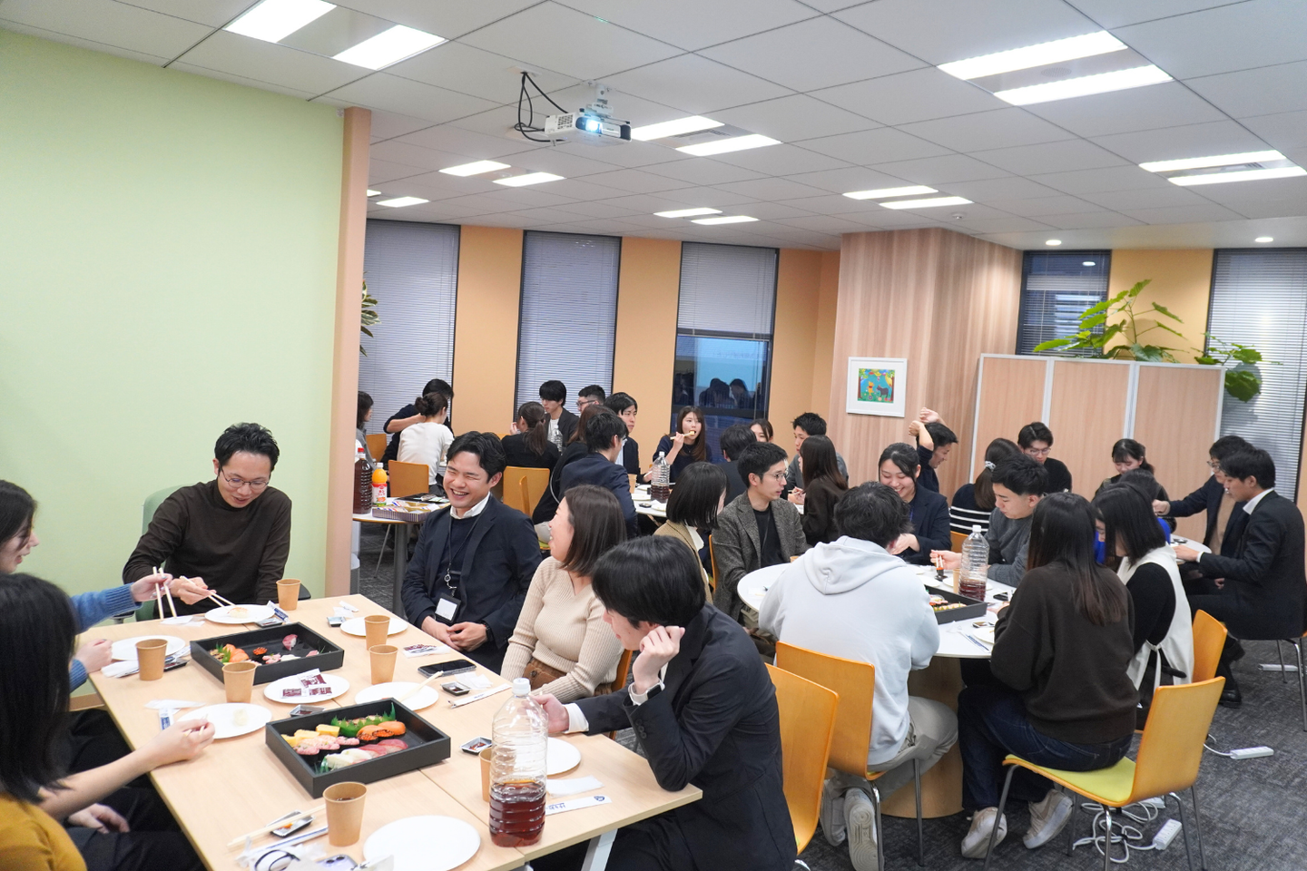 各テーブル、美味しいお寿司をいただきながら歓談を楽しみます。メンバー同士でお互いの頑張りを労いあう姿も。