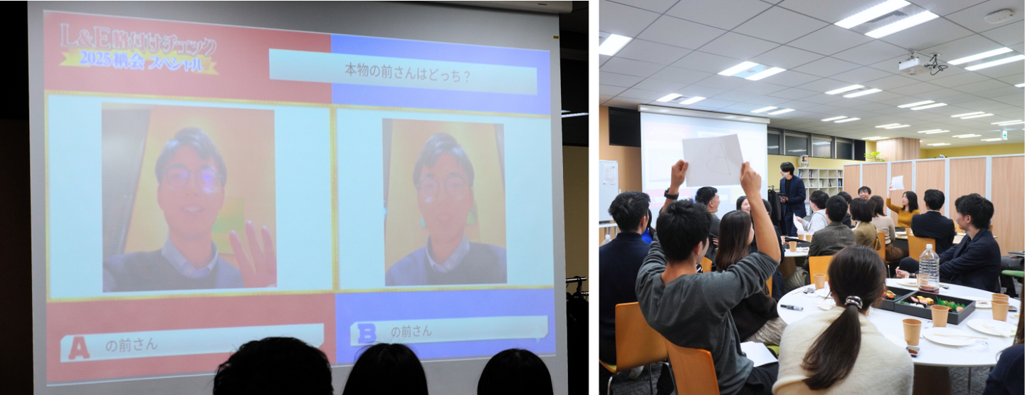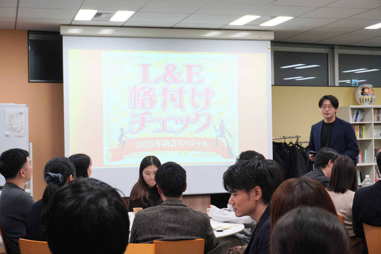 L&E Groupの2025年の出来事やメンバーに関するクイズが格付けチェック風に出題され、各テーブルで正解数を競います。