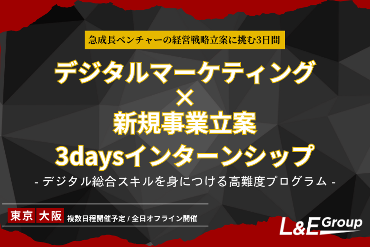 当社のインターンシップは「急成長ベンチャーの経営戦略立案に挑む3日間 デジタルマーケティングx新規事業立案3daysインターンシップ」という名称で、「デジタル総合スキルを身につける高難度プログラム」と銘打っています。