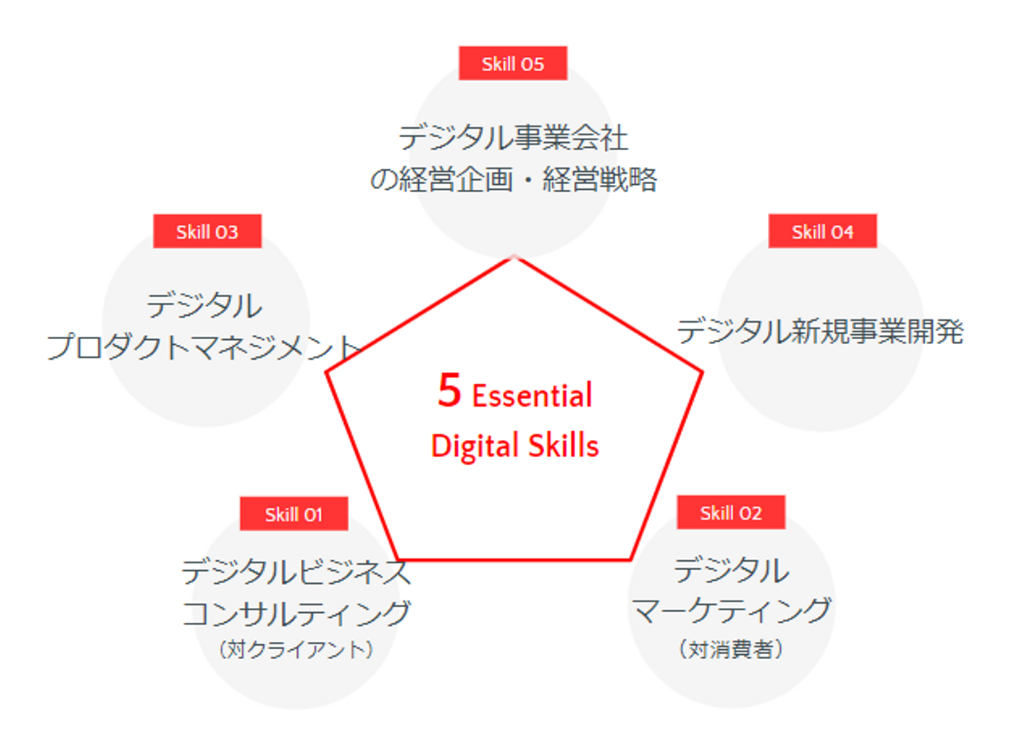 「デジタルビジネス総合プロデューサー」とは、ファーストキャリアとしてL&E Groupに入社後、5~10年間、つまり20代のうちにデジタルビジネスに関する5つの力を身につけていただく新卒向け採用枠です。