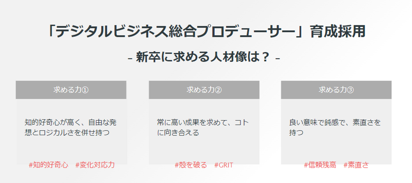 L&E Groupは「デジタルビジネス総合プロデューサー育成採用」を掲げて新卒採用を行っていて、これからの時代に活躍し続けることができる”総合力のある人材”を目指せるようになっています。