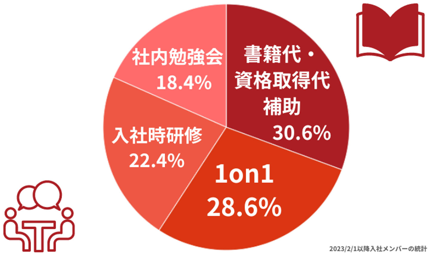 「常にアップデート」をクレドに掲げ、学びの文化が浸透しているL&E Group。あってよかった教育制度では「書籍代・資格取得代補助」が第1位でした!自己研鑽としてビジネス本を月に数冊読んだり外部のセミナーを受講したりするメンバーが多く、それらの補助がありがたいという声が。学んだ内容についてはチャット等で共有しているため、他メンバーも含めて知識が蓄積されていきます。