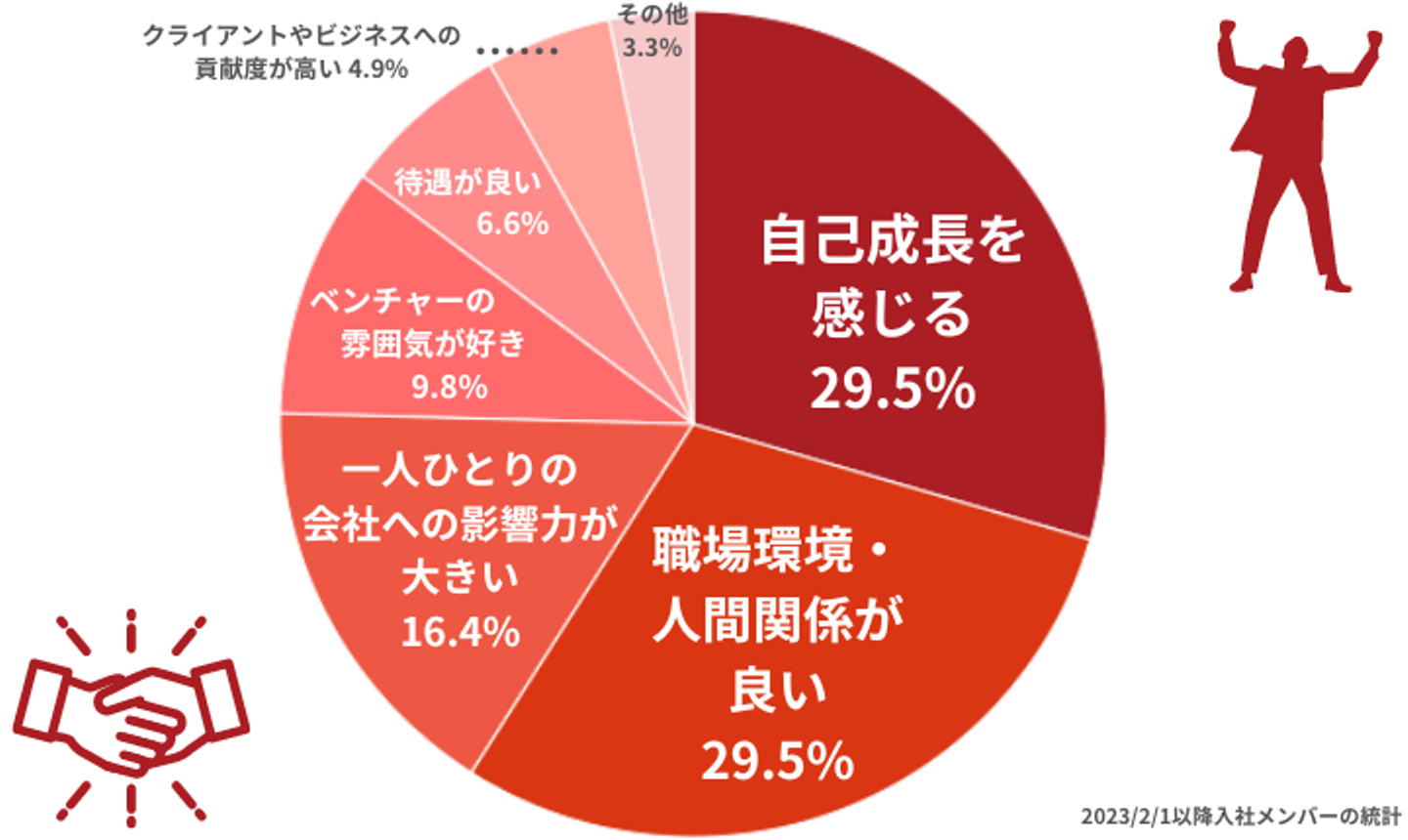 また、今回得票数を伸ばしたのが「経営陣・メンバーの人柄」。特に新卒は就活中に短期インターンシップに参加したメンバーが多く、「インターンでメンターとして参加していたメンバーが全員魅力的だった」「こんな人になりたいと思えるメンバーがいた」とメンバー達に憧れて入社したという声が多く見られました!