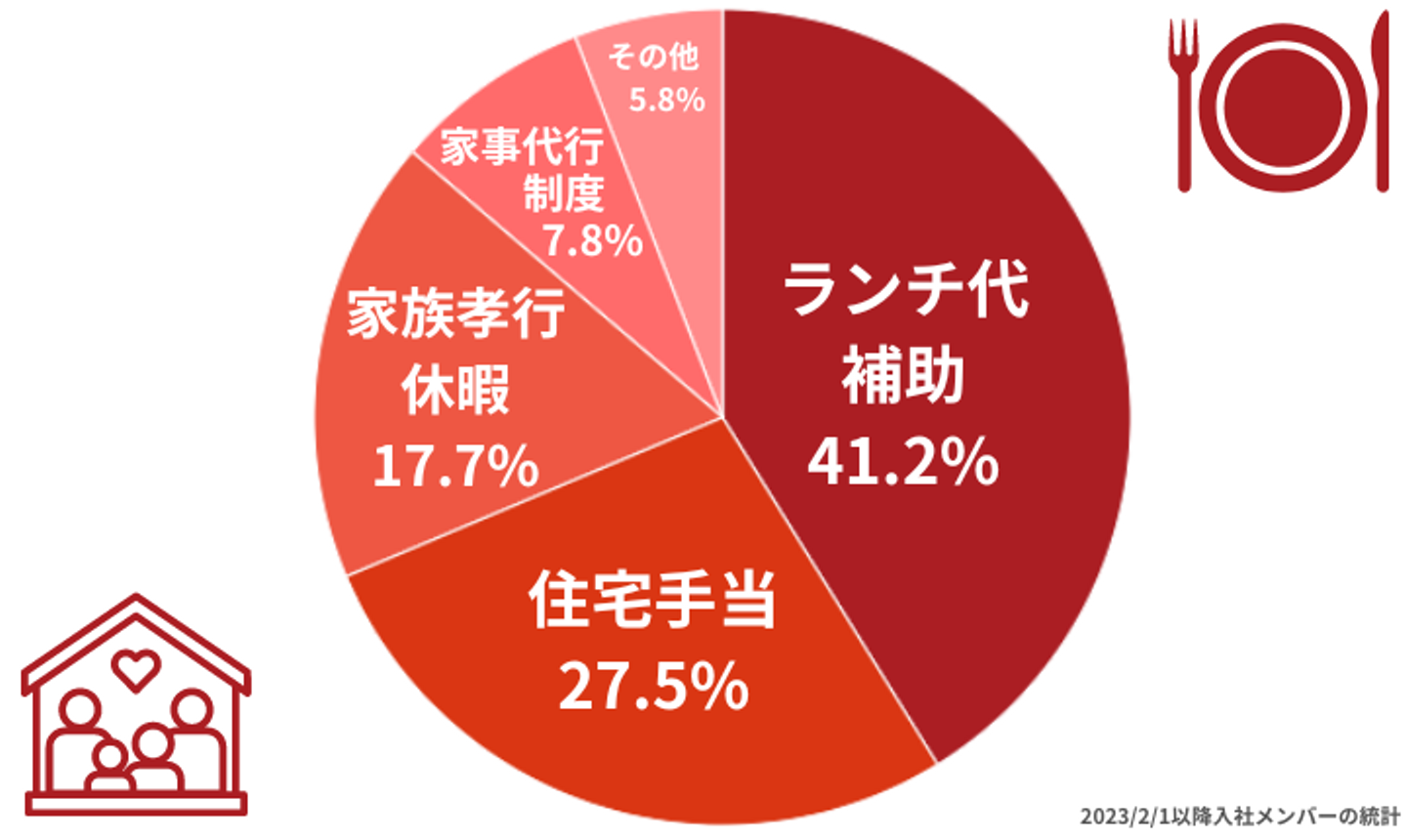 通勤ストレス回避の目的で、会社最寄り駅から3駅以内に住んでいる人がもらえる「住宅手当」、家族へ感謝を伝える目的で、家族の誕生日の際に休みがもらえる「家族孝行休暇」も引き続き大人気!