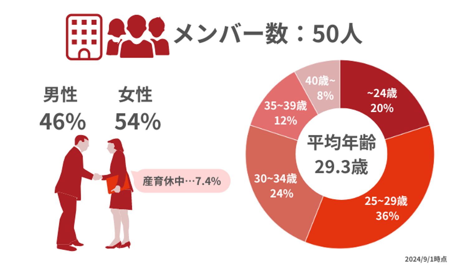 男女ともに既婚率が高く、ママメンバーの産育休・時短勤務はもちろん、パパメンバーの育休取得も促進中。「若手の時だけでなく、ライフイベントを迎えても長く頑張り続けたい」という成長意欲の高いメンバーばかりです!