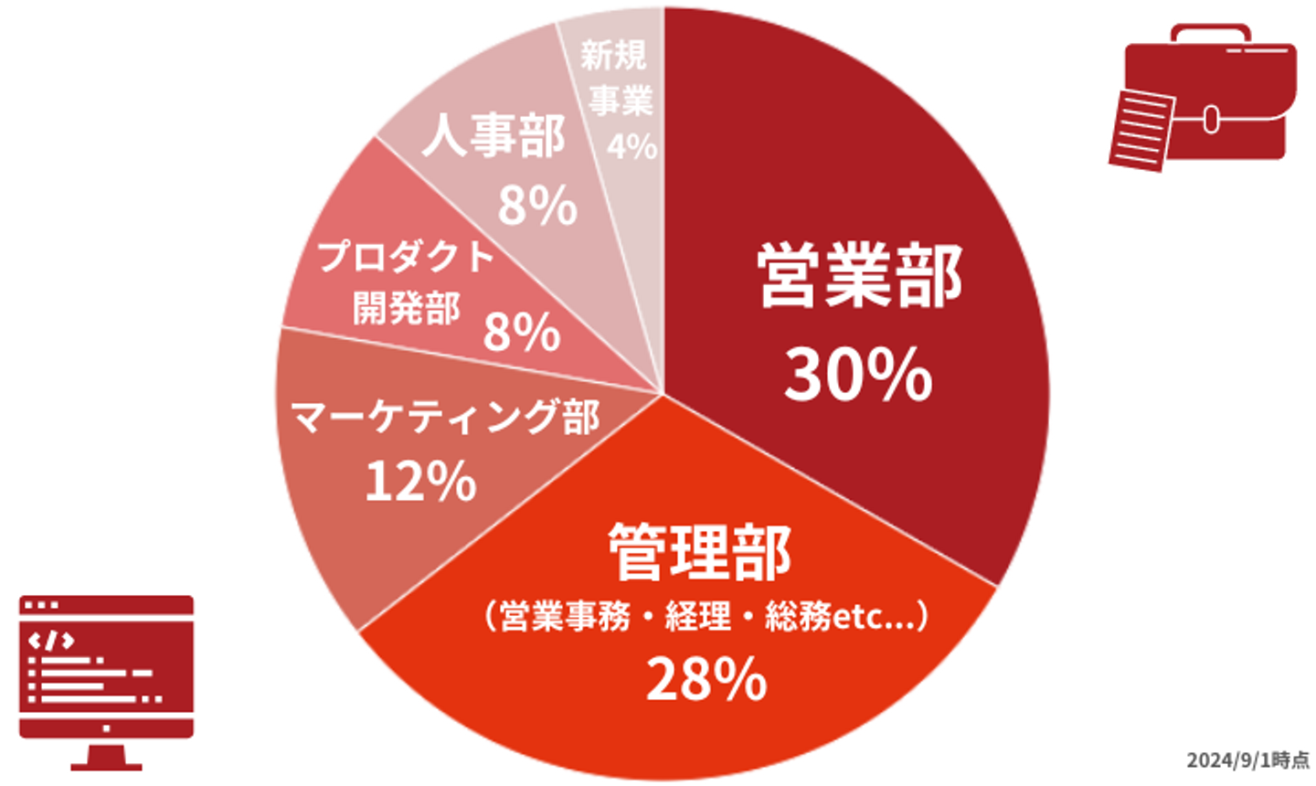 自己成長のために異動や兼務をフレキシブルに行う会社なので、管理部からマーケティング部へ異動したり、プロダクト開発部から数週間他部署に在籍("留学"と呼んでいます)したりといった事例も。