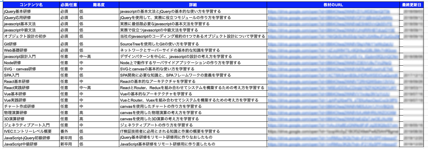 今年度の新卒が受けた技術研修は以上の通りです。