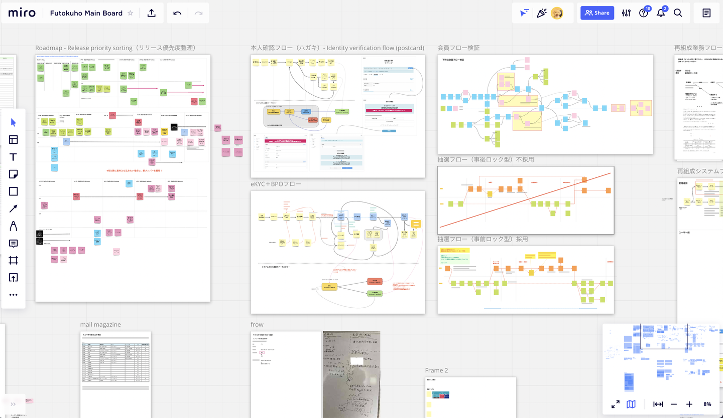 フロー化する際はmiroを活用しています。miroは、簡単に言えば無限に広がるホワイトボードです。フロー図以外にも、企画段階のアイデアラッシュに使ったり、ヒアリングした情報などを一元的にまとめていたりなどLepusではヘビーユースします。
