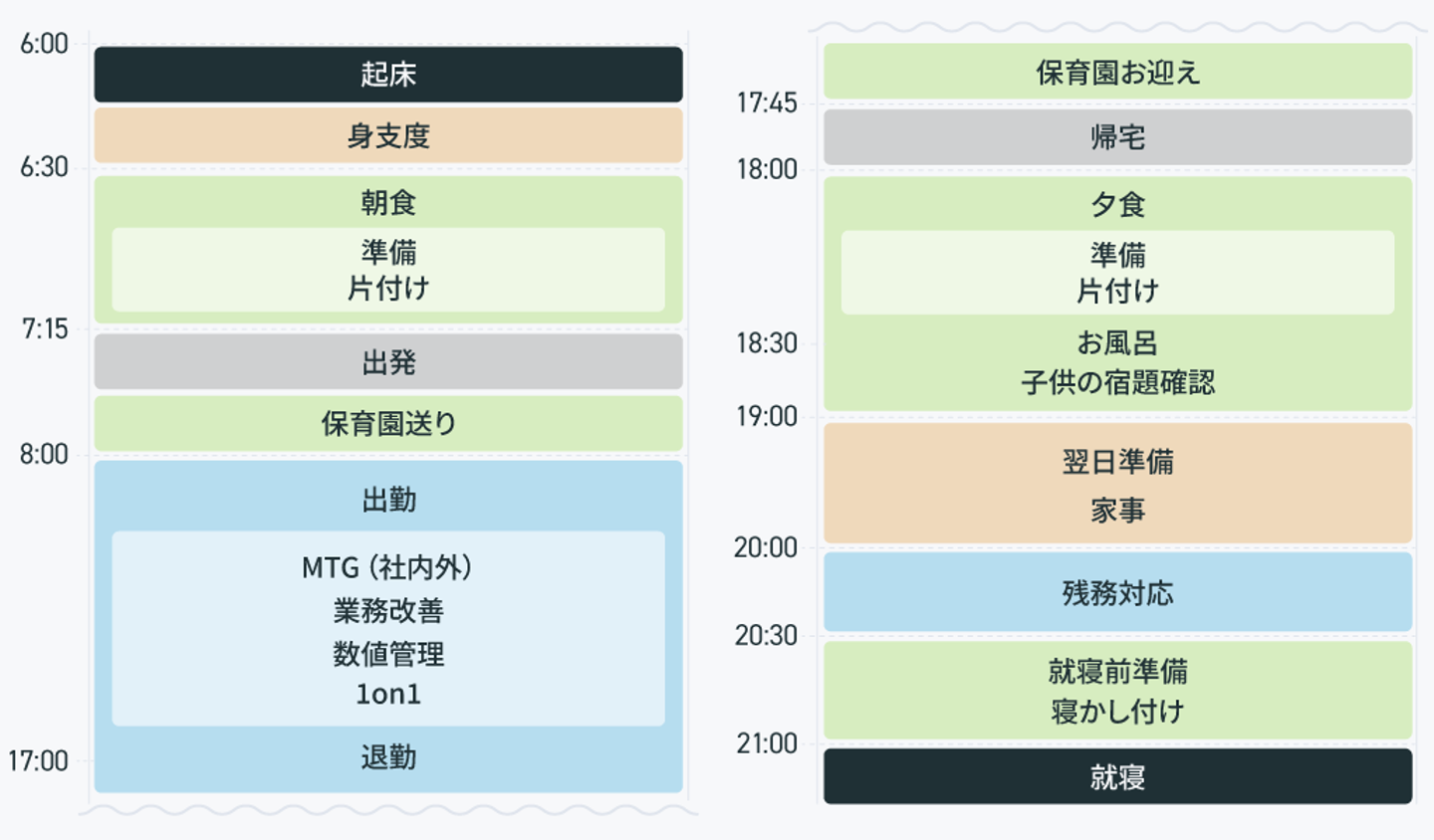 現在は、時差出勤制度を使って8時から17時まで働いています。退勤後は保育園へお迎えに行き、家事を済ませるというルーティーンです。子どもが病気のときには、子の看護による在宅勤務制度も利用しています。これらの制度があるおかげで、仕事をしながらも夕方以降に子どもと過ごす時間を確保できたり、子どもが病気の際に看病ができたりと、安心して子育てができています。