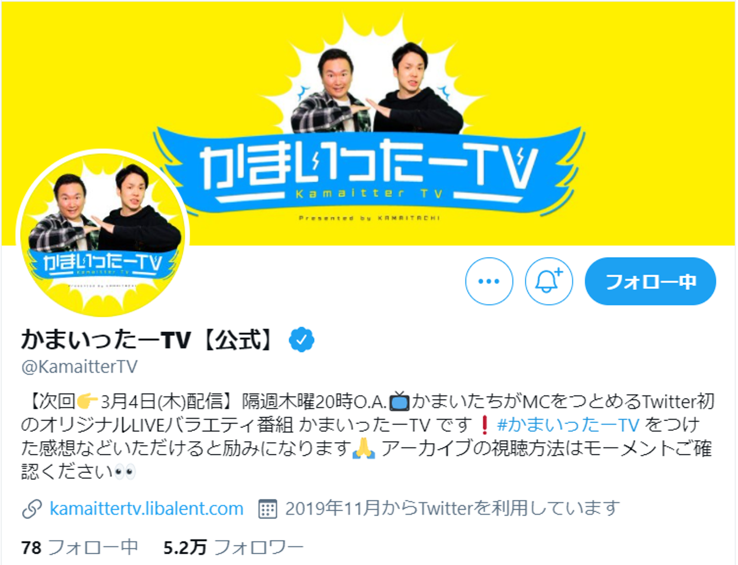お笑い芸人のかまいたちがMCを務めるTwitter初のライブ配信型のバラエティ番組です。