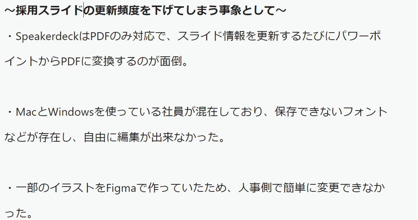 これまでは採用スライドを採用HPに掲載するためにSpeaker Deckを利用しておりました。毎月スライドの情報を変更するたびに、スライドデータをパワーポイントからPDFに変換。その後Speaker DeckにPDFをアップロード。正直、この作業がとても面倒と感じていたのです。