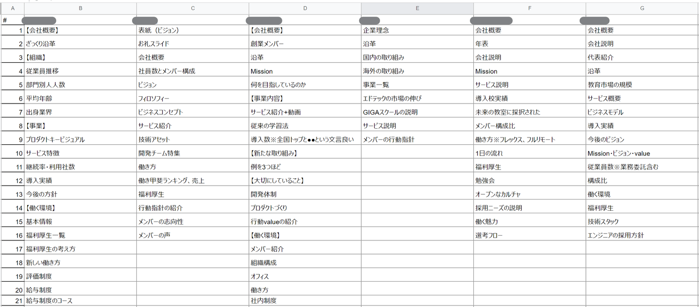 採用力があるといわれている企業約20社をピックアップし、企業ごとにどのような情報をどんな順番で見せているのかスプレッドシートにまとめて分析。※参考になった各社採用スライドのまとめリンク集