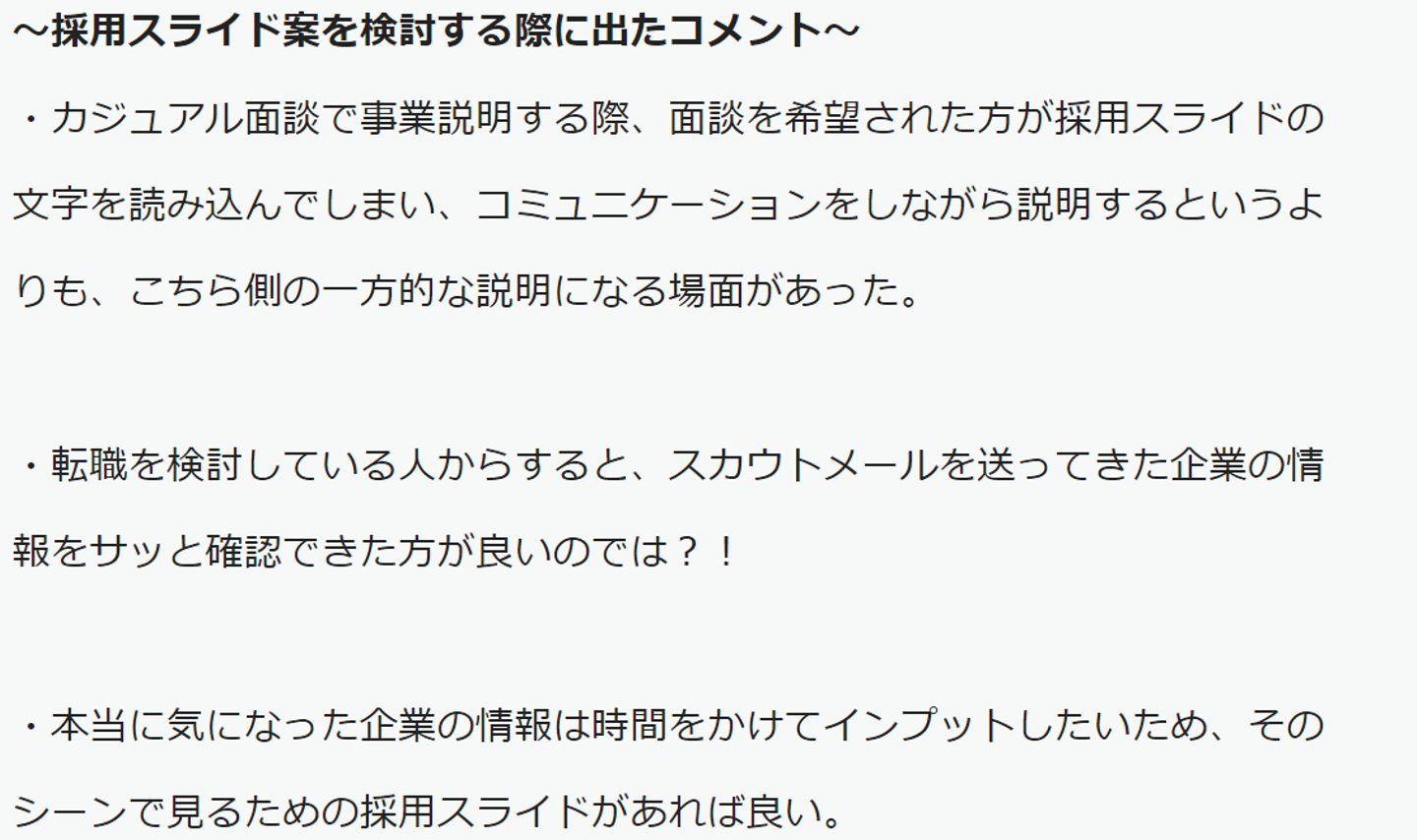 これまで使っていた採用スライドにはたくさんの情報が載っていて面談中も伝える情報量が多かった、またどんな企業なのか知りたい求職者がサッと見れるスライドを作りたかった。