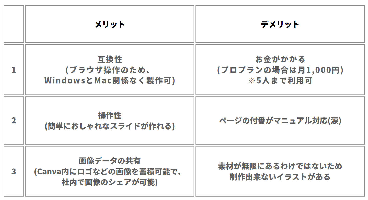 デザイン部から新たにCanvaというツールを使ってみないかと提案がありました。下記にメリット・デメリットは記載しましたが、これまではGoogleスライドやパワーポイントを使用していたので、初めの頃は右も左もわからない状態。そんな中「Canva」でスライドを作るという新たなチャレンジがスタート。