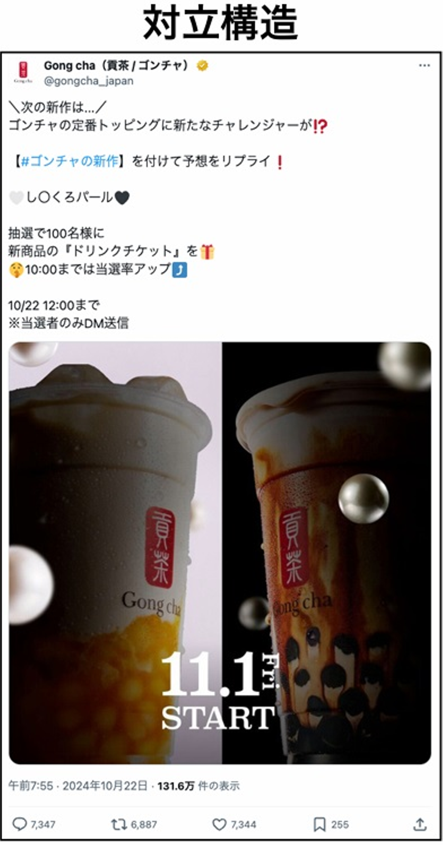 さらに、台湾茶の専門チェーン店Gong chaの投稿では、新商品を「白」と「黒」という色で対立させています。暗い背景と光沢のあるビジュアルを組み合わせ、商品のプレミアム感や期待感を演出。これにより、ただ新商品を紹介するだけでなく、視覚的な対比がストーリー性を持たせ、ブランドイメージを強化しています。