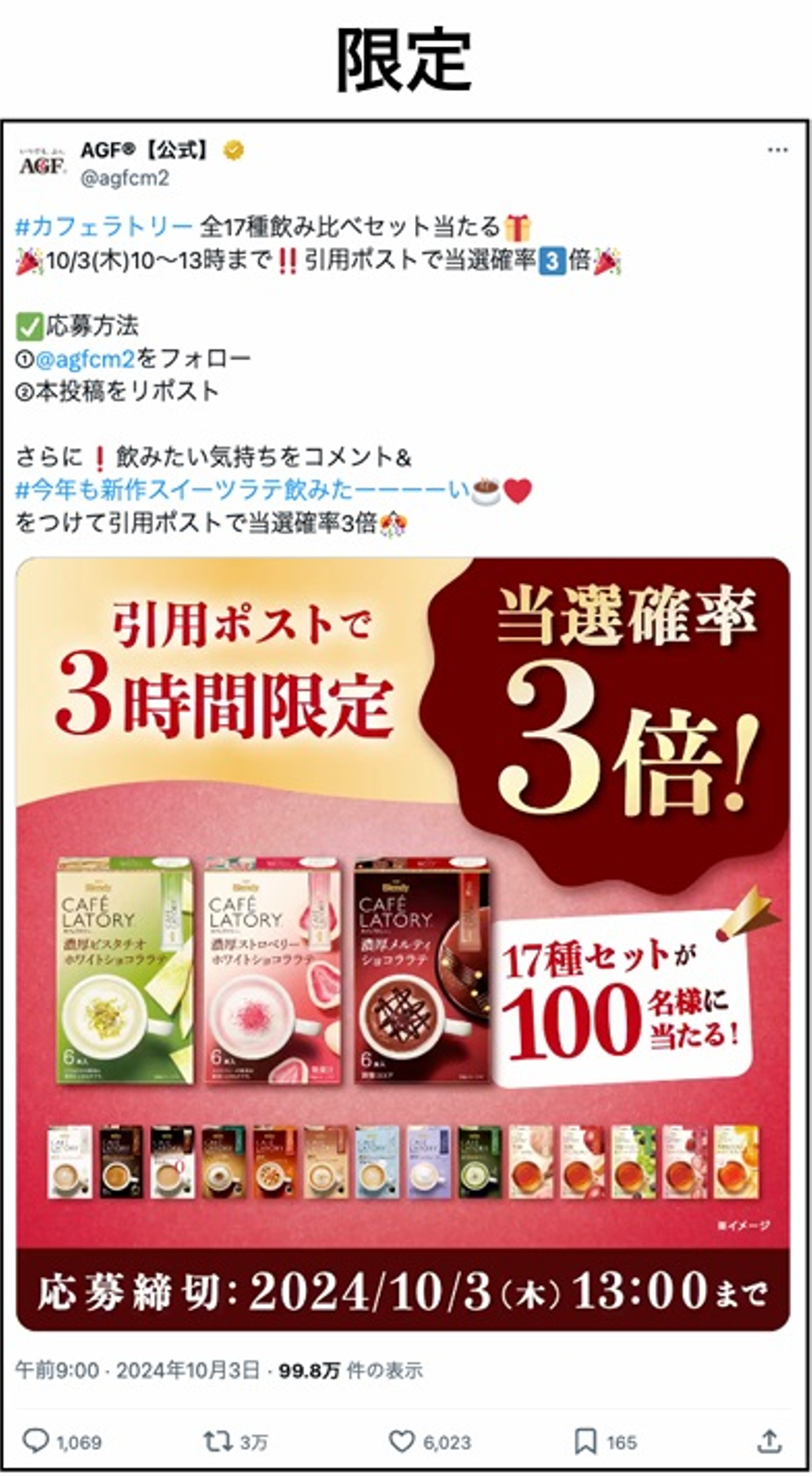 AGFの投稿では、「3時間限定」という時間制限を強調したキャンペーンで、即時にユーザーの行動を促す戦略をとっています。
