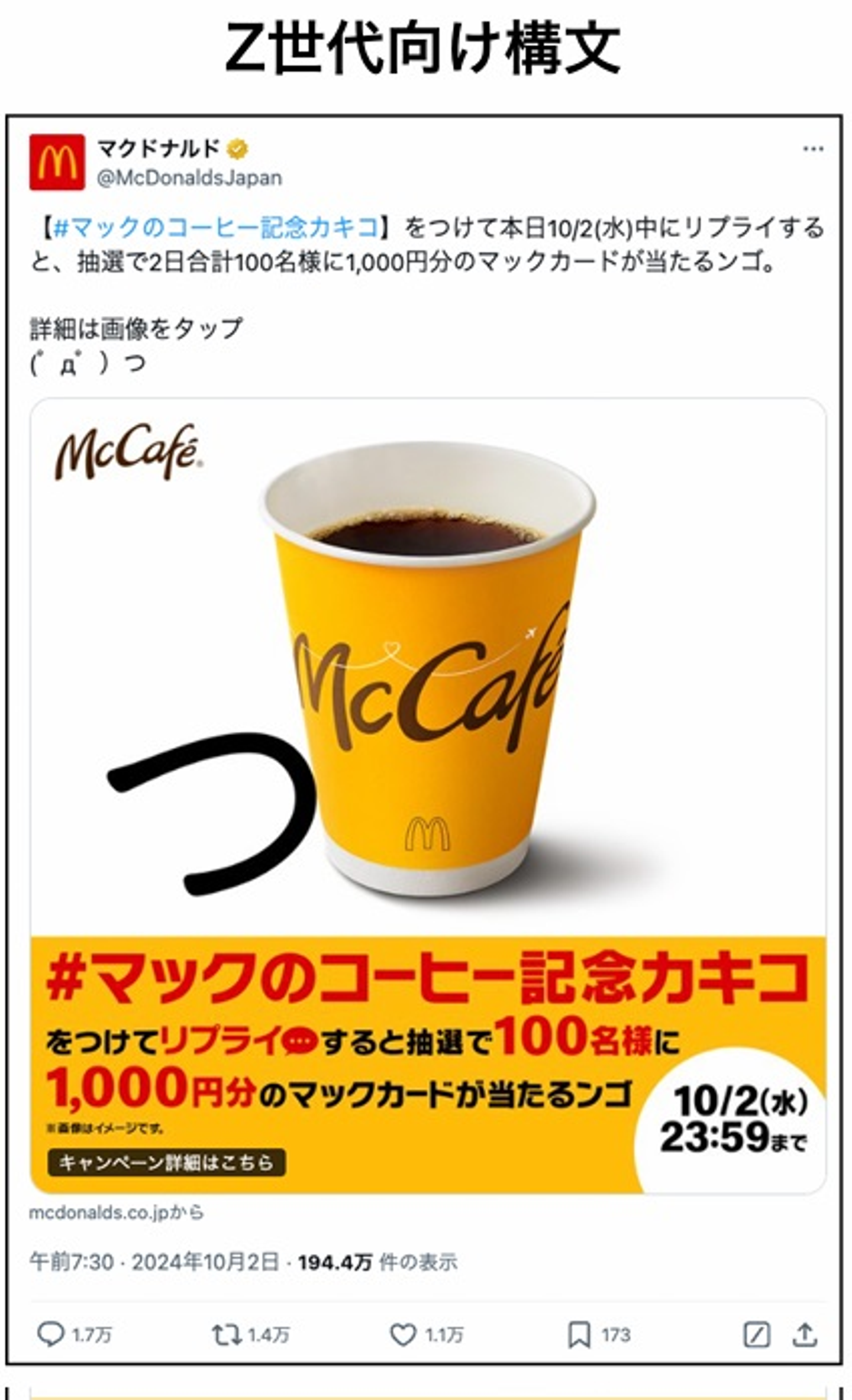 マクドナルドの投稿では、Z世代を意識した親しみやすい言葉やデザインが印象的です。たとえば、「カキコ」や「当たるンゴ」といった軽いノリの言葉遣いで、フランクな雰囲気を演出。また、黄色の背景や大きな文字で視覚的に目を引き、重要な情報は赤で強調しています。